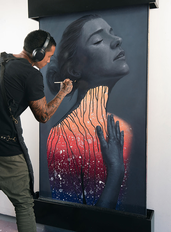 Complete with a unique water feature that symbolises new waves of energy and the desire to create a pathway towards reaching the goals behind them, Hula balances mankind and nature. Through this painting, he promotes the values of personal and environmental sustainability needed for a New Humanity.