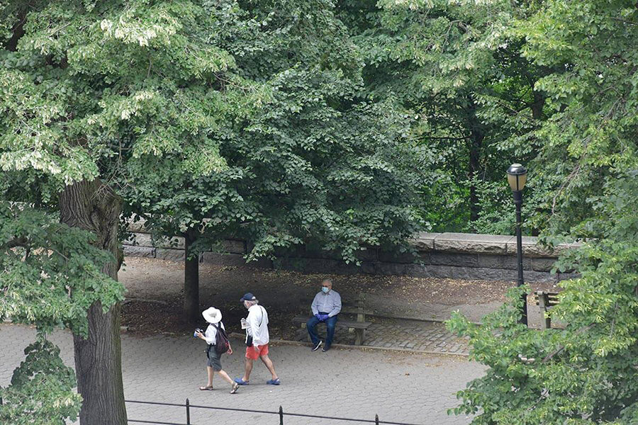 During the many months of sheltering at home, I photographed a steady parade of people of all ages wearing masks walking, running, rolling by and sitting on my bench. - Martha Cooper